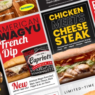 Our eye-catching point-of-sale materials like posters, counter cards, and window graphics instantly grab customers’ attention and highlight Capriotti’s limited-time offers. Each piece reinforces the brand’s bold personality while clearly showcasing their featured sandwiches and deals. These materials are rolled out system-wide to boost in-store traffic and drive immediate sales.